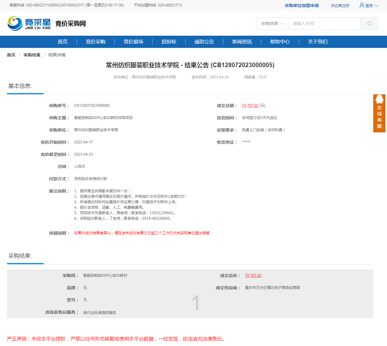 【成交公告】智能控制实训中心实训耗材采购项目成交公告