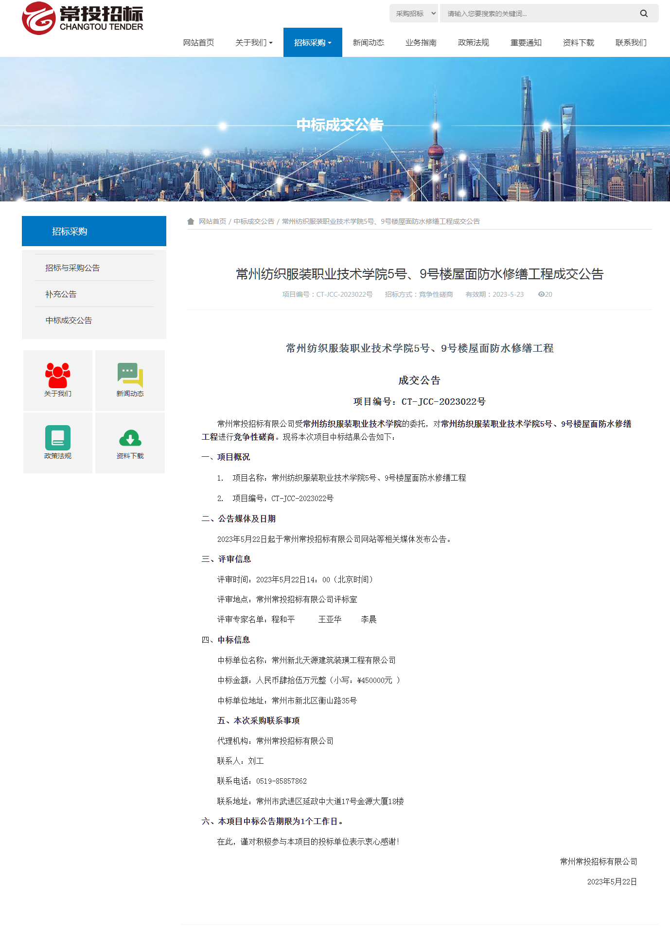 【成交公告】5号、9号楼屋面防水修缮工程成交公告