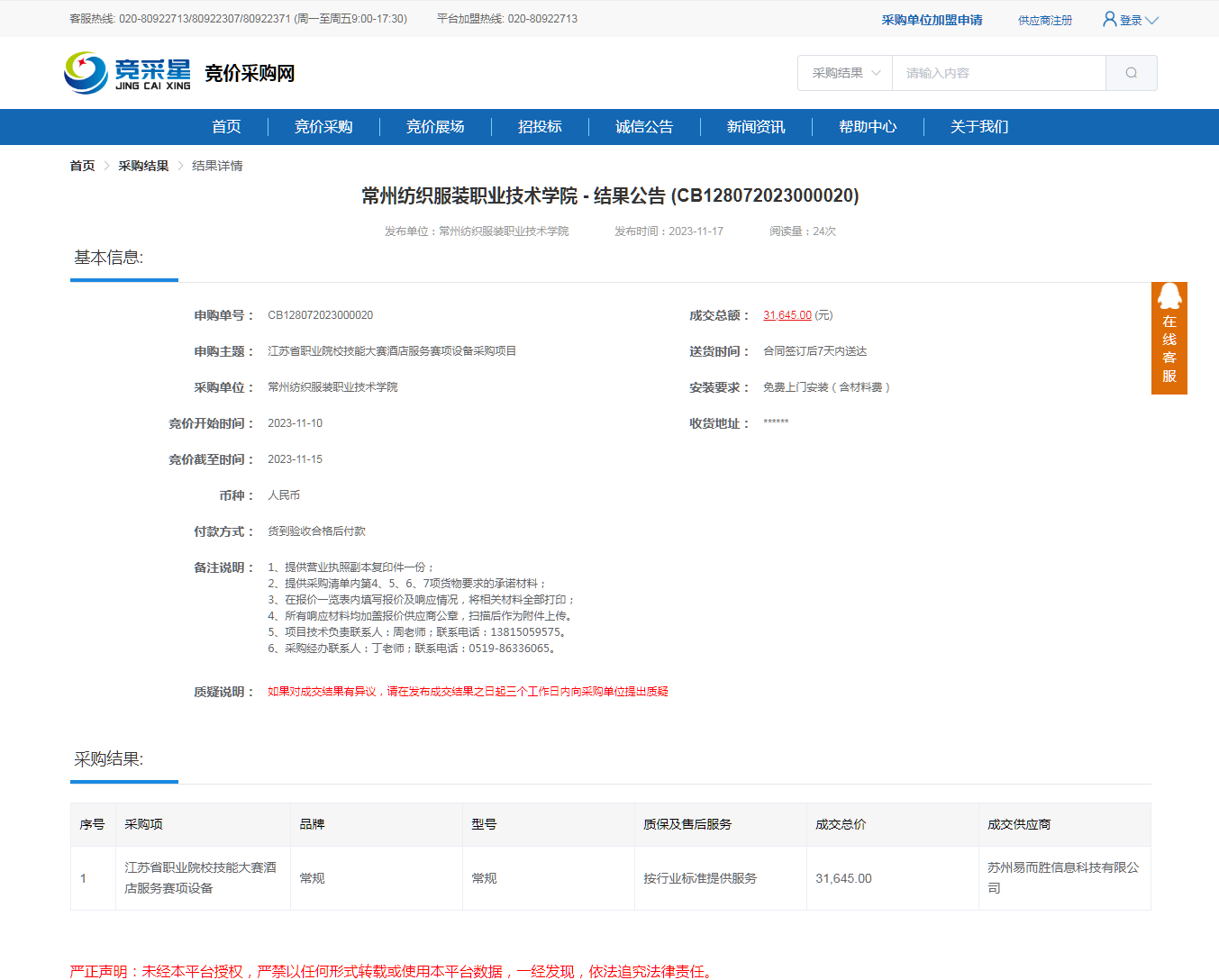 【成交公告】江苏省职业院校技能大赛酒店服务赛项设备采购项目成交公告