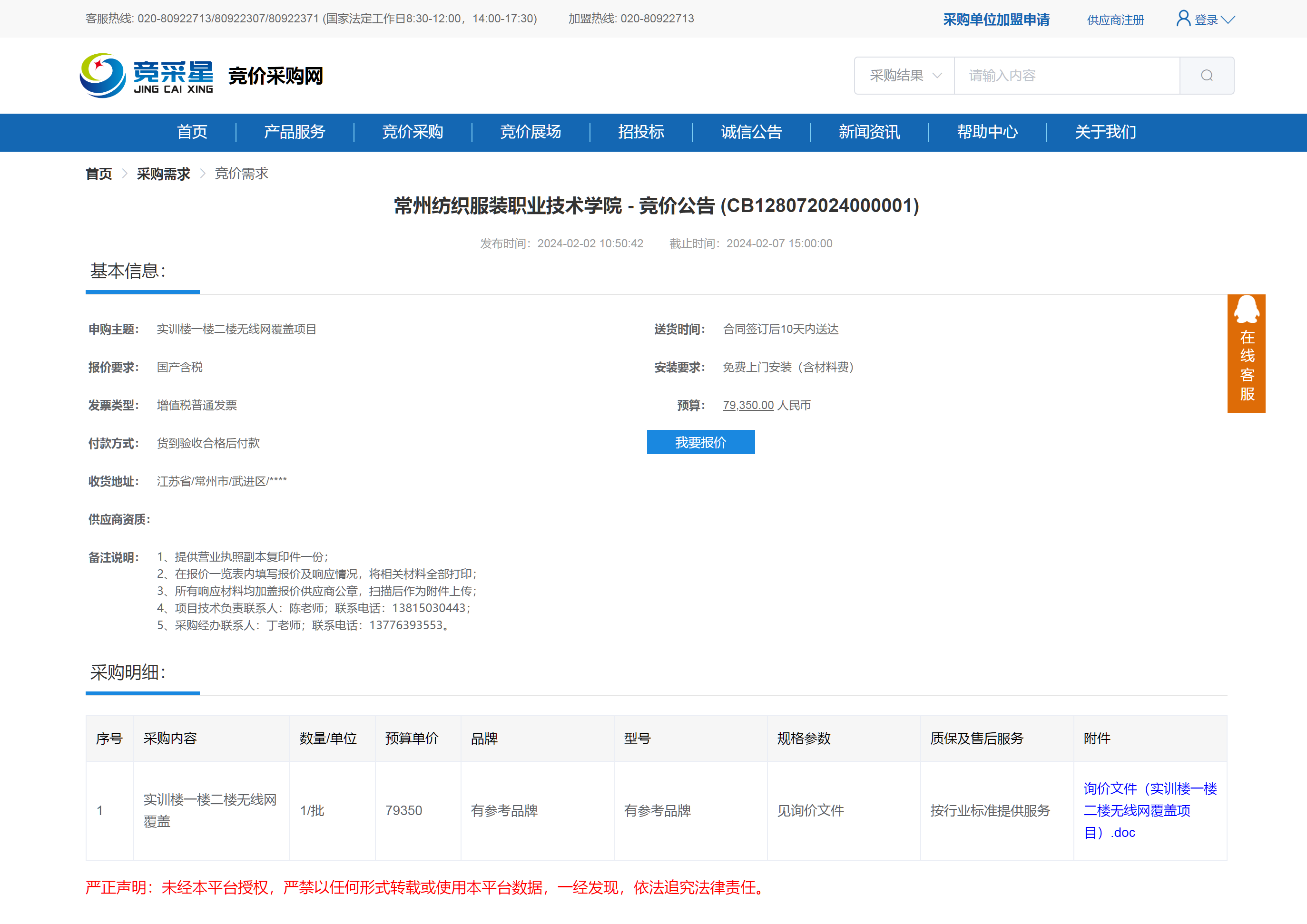 【采购公告】实训楼一楼二楼无线网覆盖项目询价公告