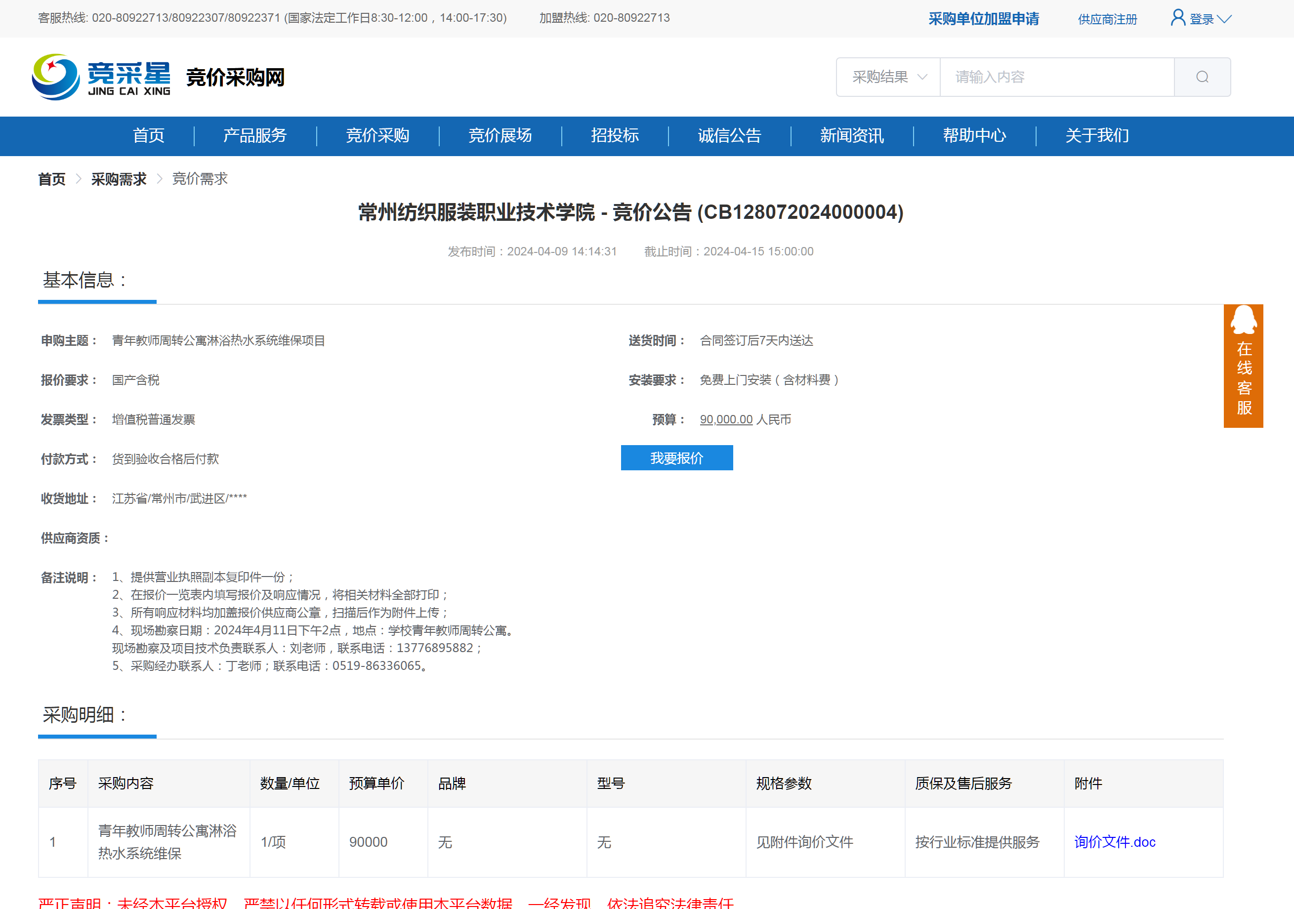 【采购公告】青年教师周转公寓淋浴热水系统维保项目询价公告
