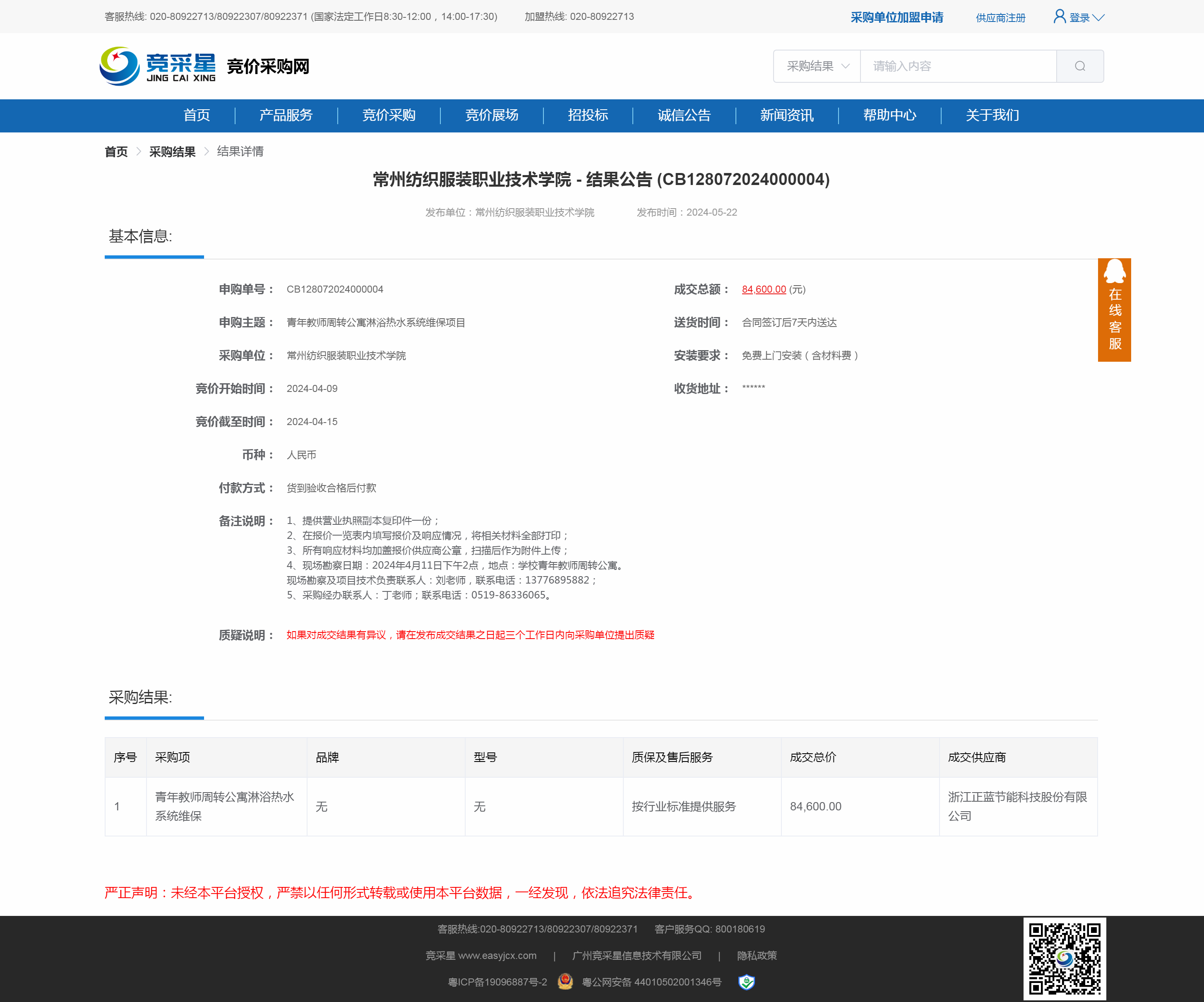 【成交公告】青年教师周转公寓淋浴热水系统维保项目成交公告