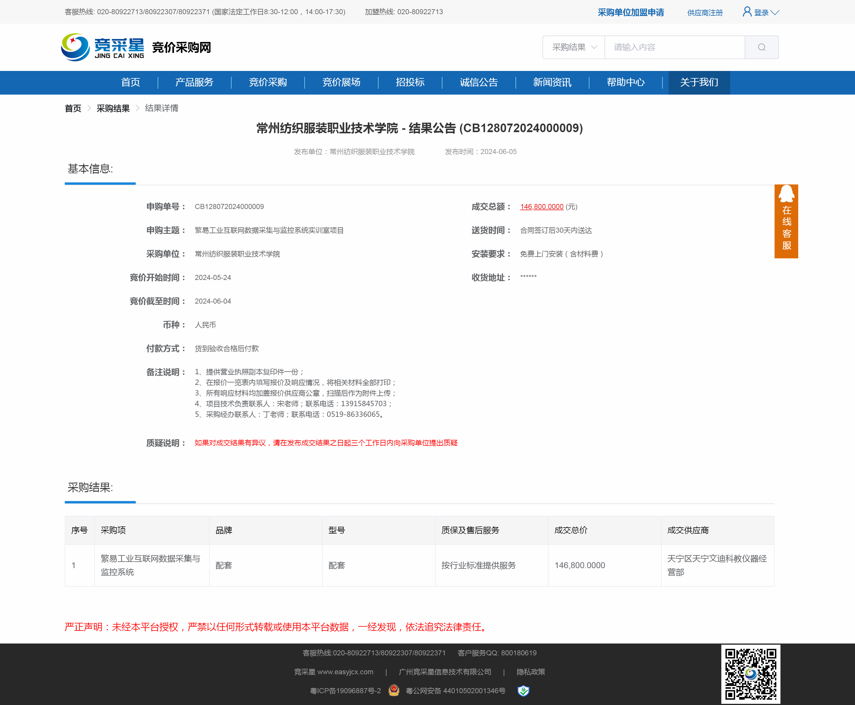 【成交公告】繁易工业互联网数据采集与监控系统实训室项目成交公告
