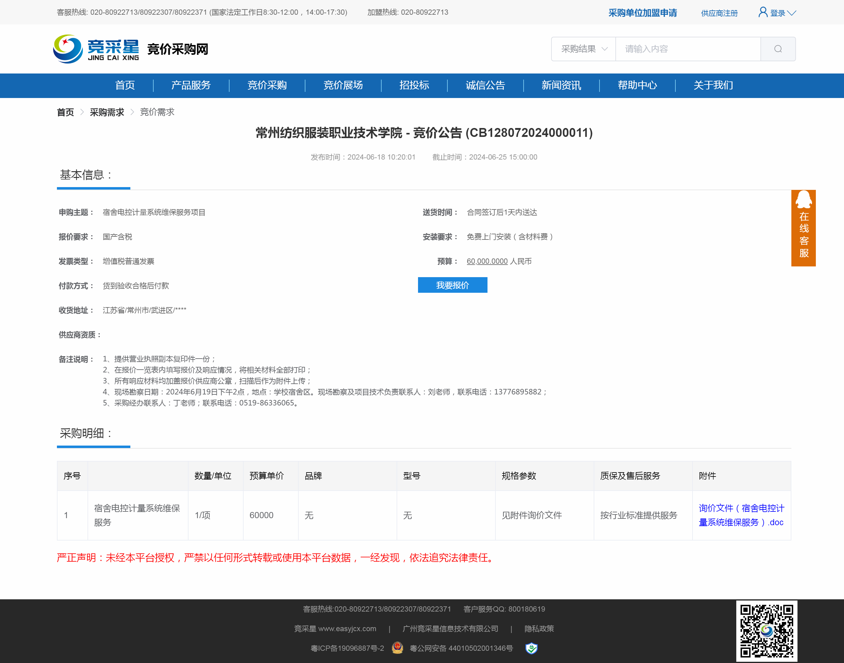 【采购公告】宿舍电控计量系统维保服务项目询价公告