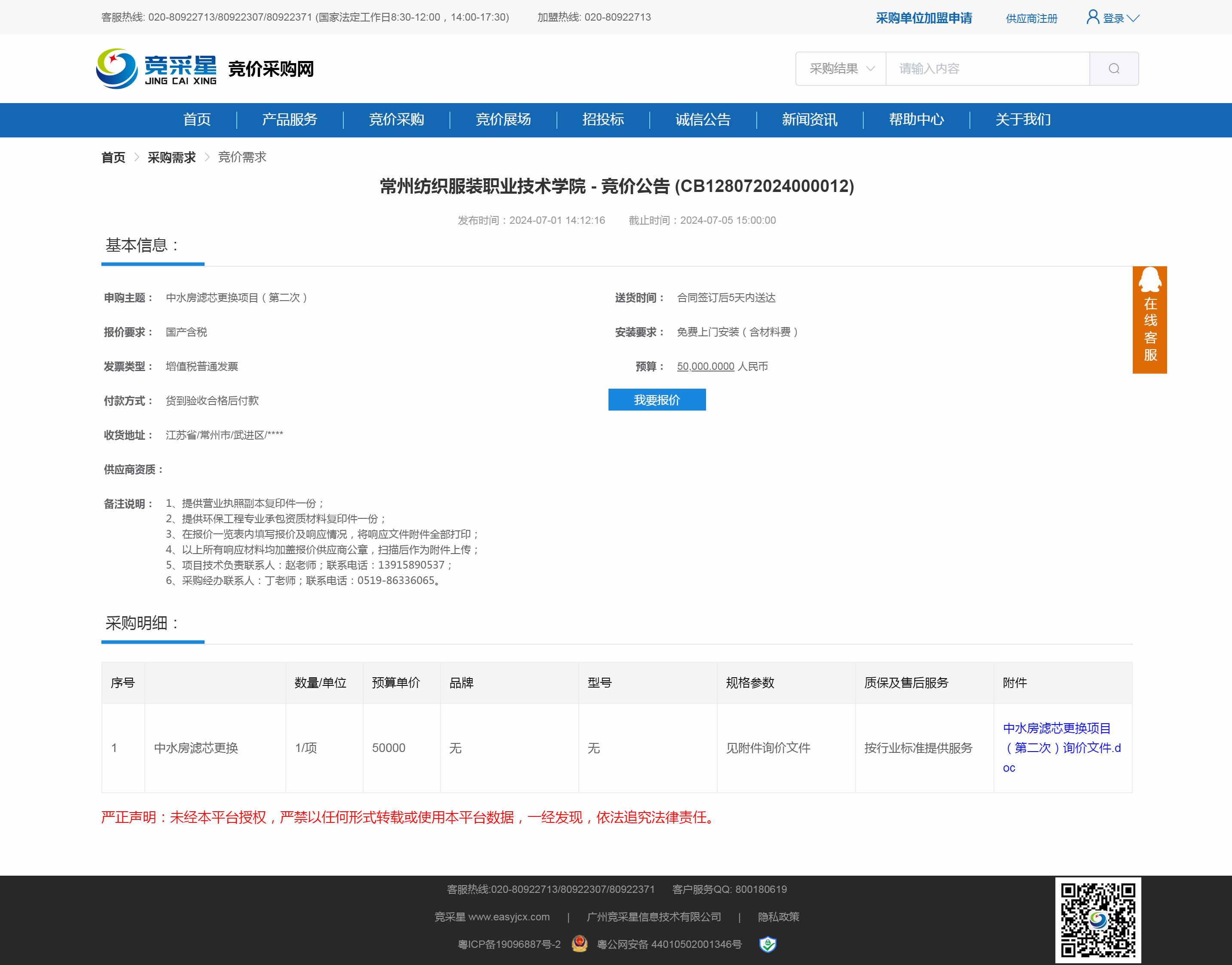 【采购公告】中水房滤芯更换项目(第二次)询价公告