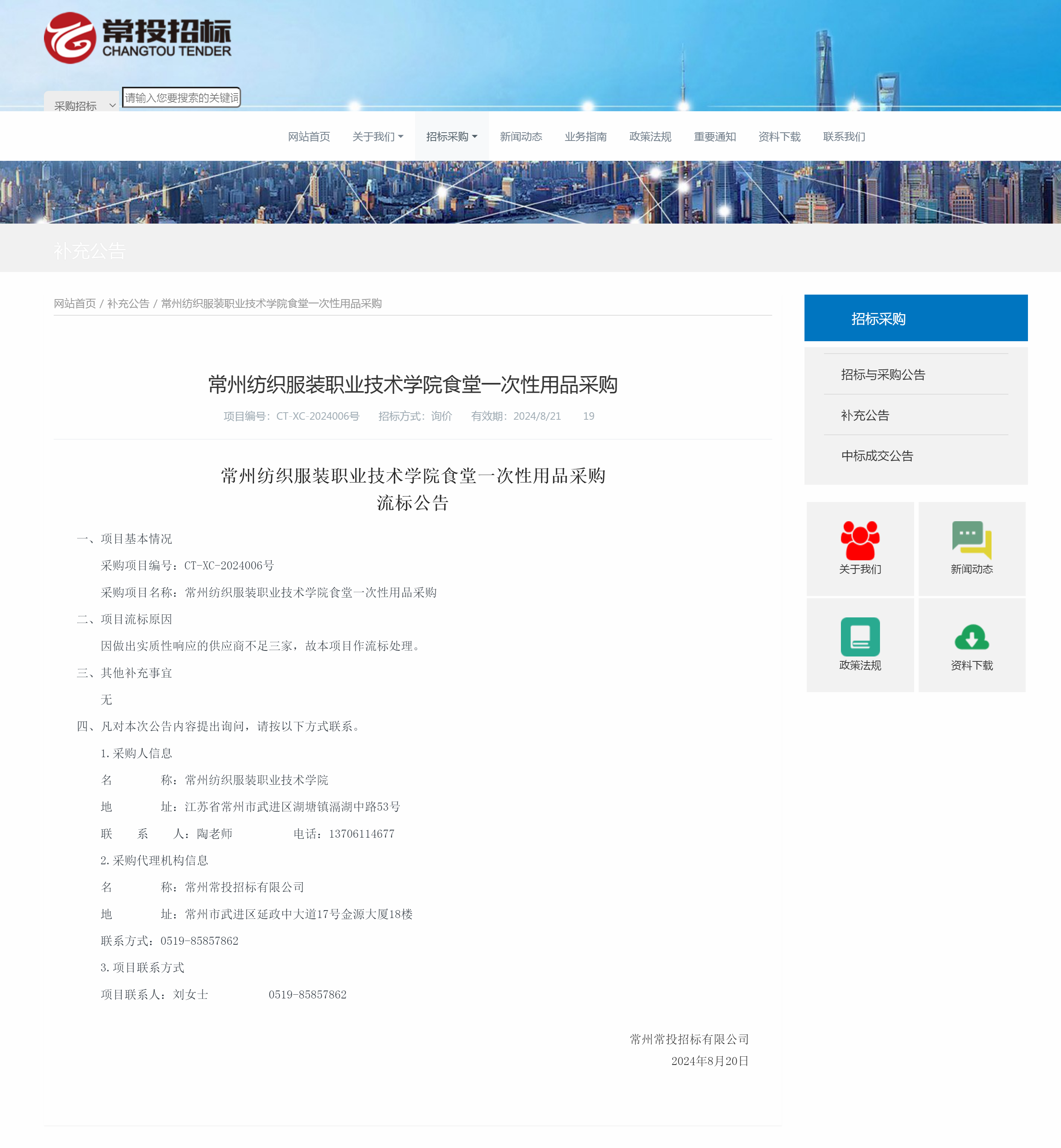 【流标公告】食堂一次性用品采购项目流标公告(第三次)