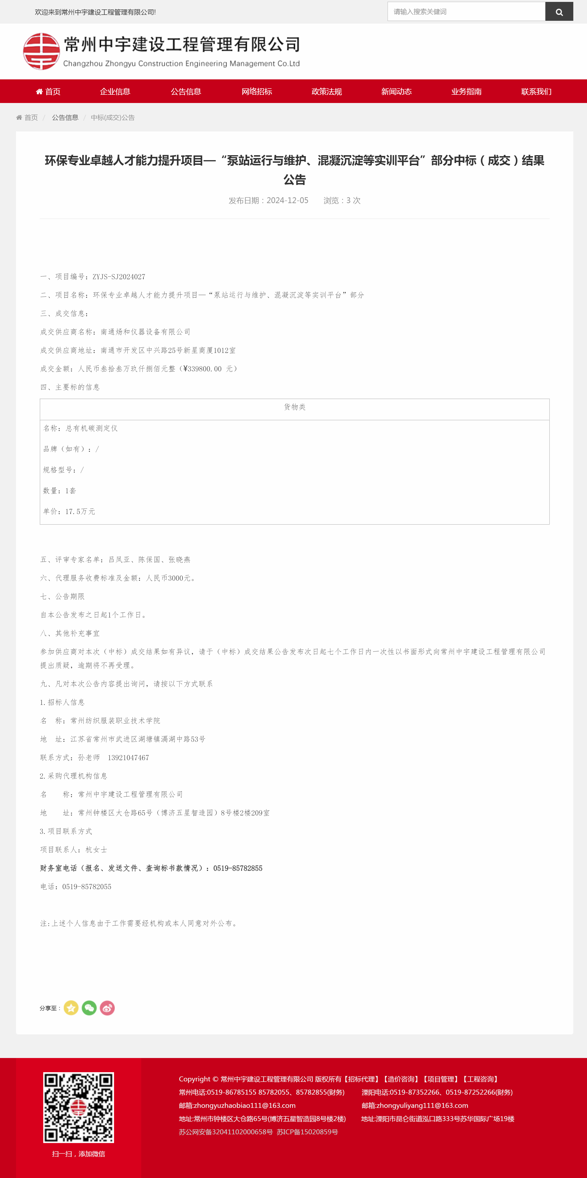 【成交公告】环保专业卓越人才能力提升项目—“泵站运行与维护、混凝沉淀等实训平台”采购项目成交结果公告