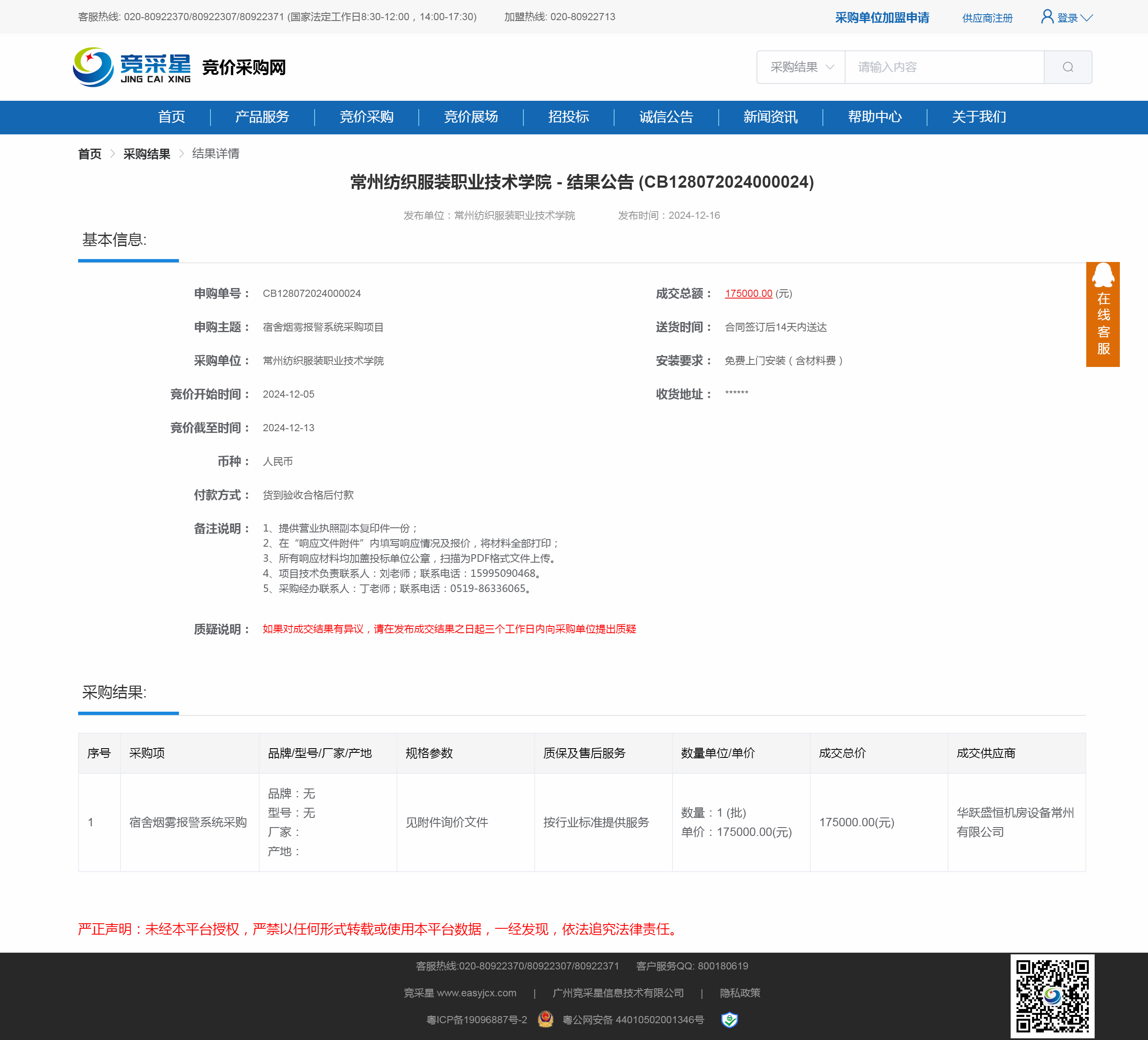 【成交公告】宿舍烟雾报警系统采购项目成交公告