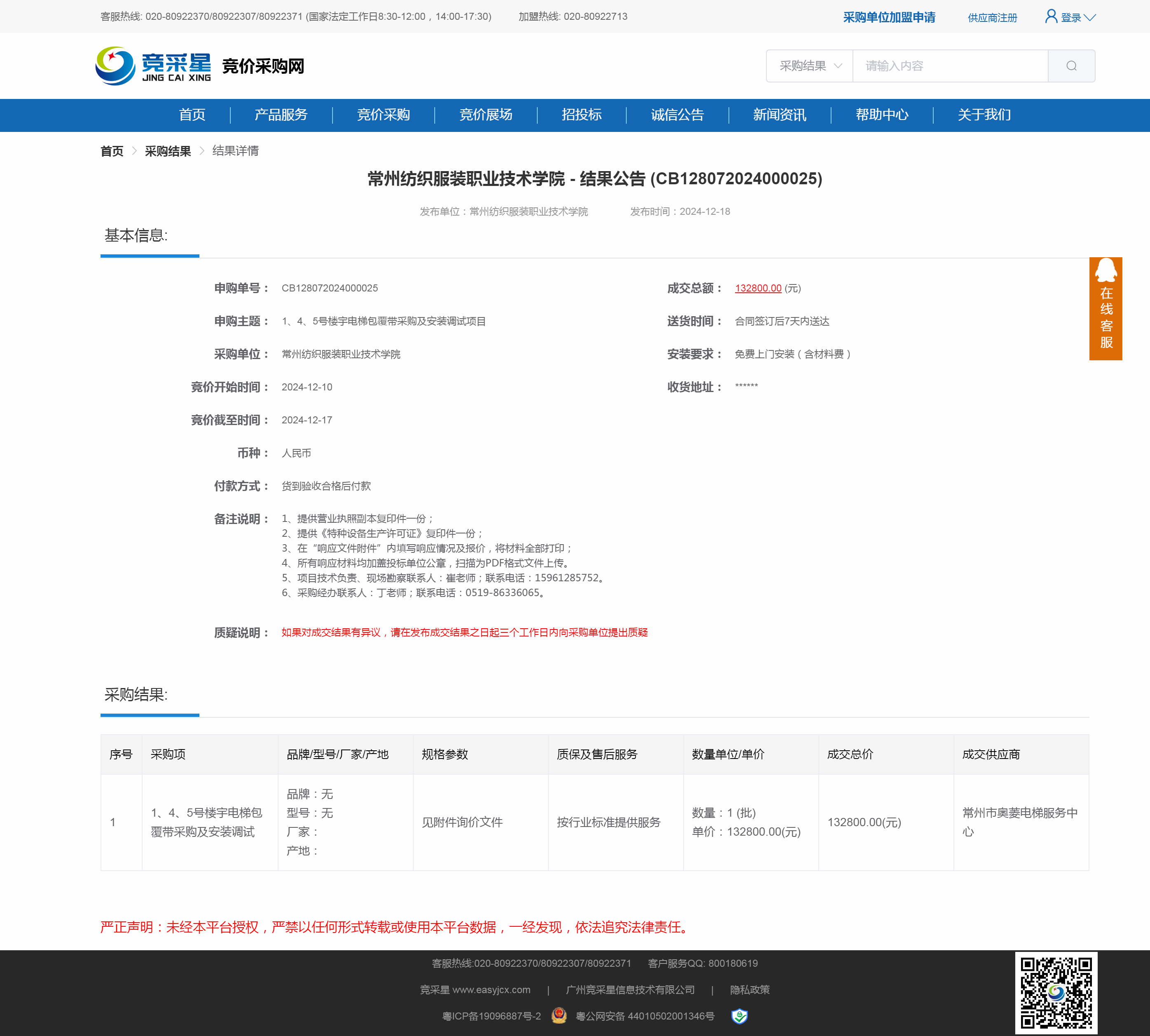 【成交公告】1、4、5号楼宇电梯包覆带采购及安装调试项目成交公告