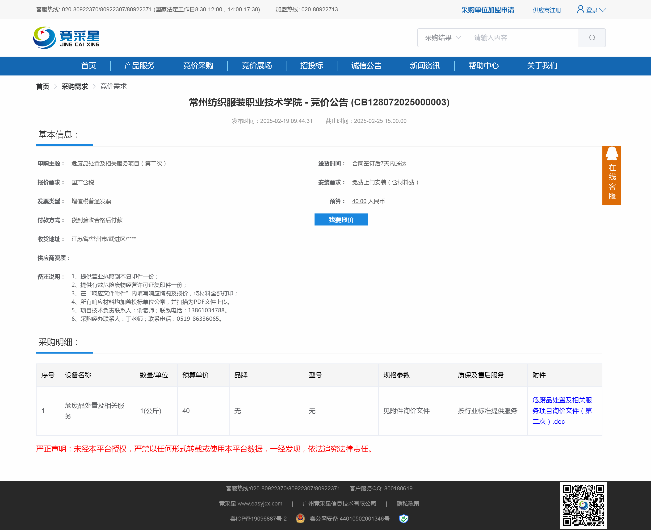 【采购公告】危废品处置及相关服务项目(第二次)询价公告