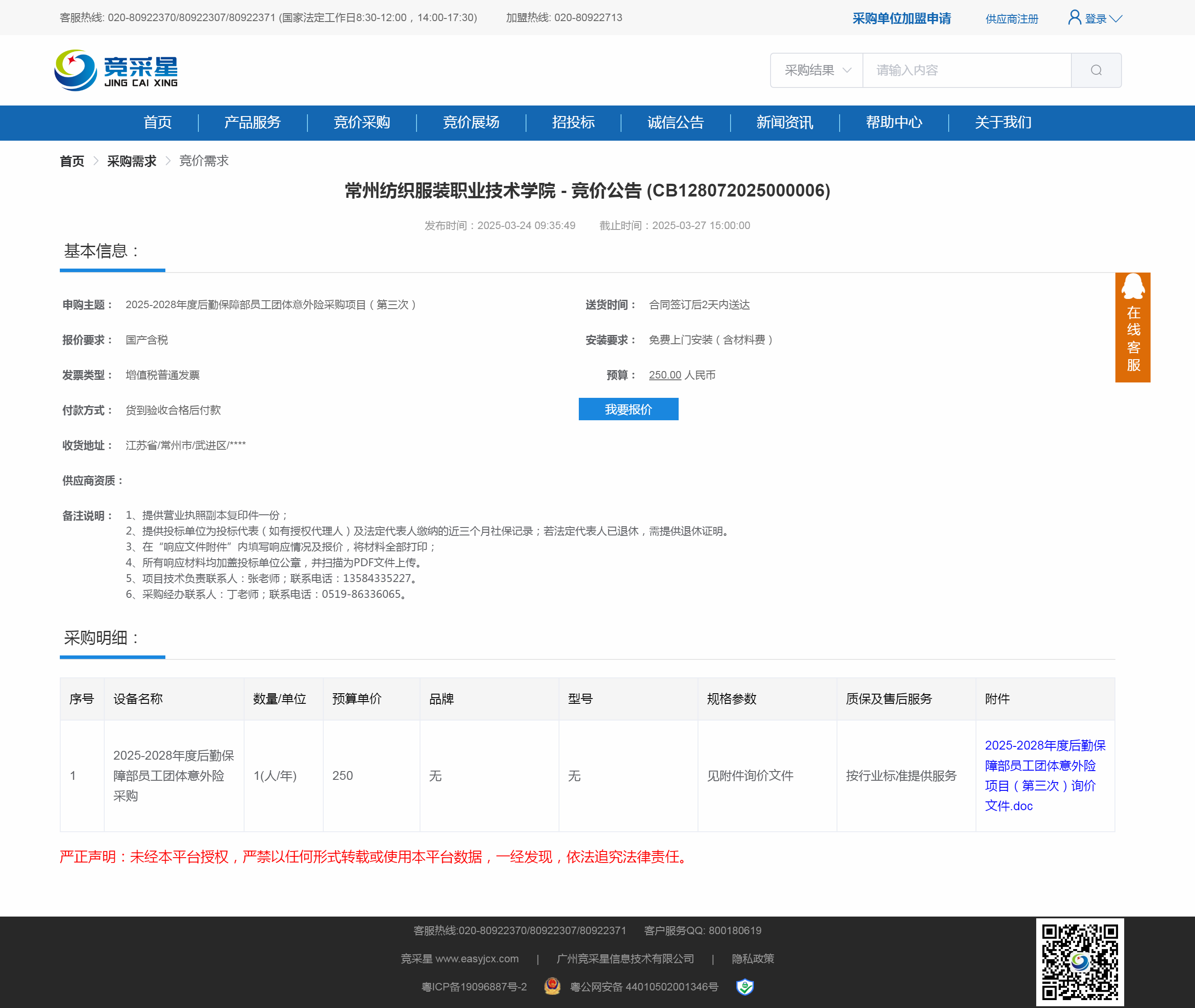 【采购公告】2025-2028年度后勤保障部员工团体意外险采购项目(第三次)询价公告