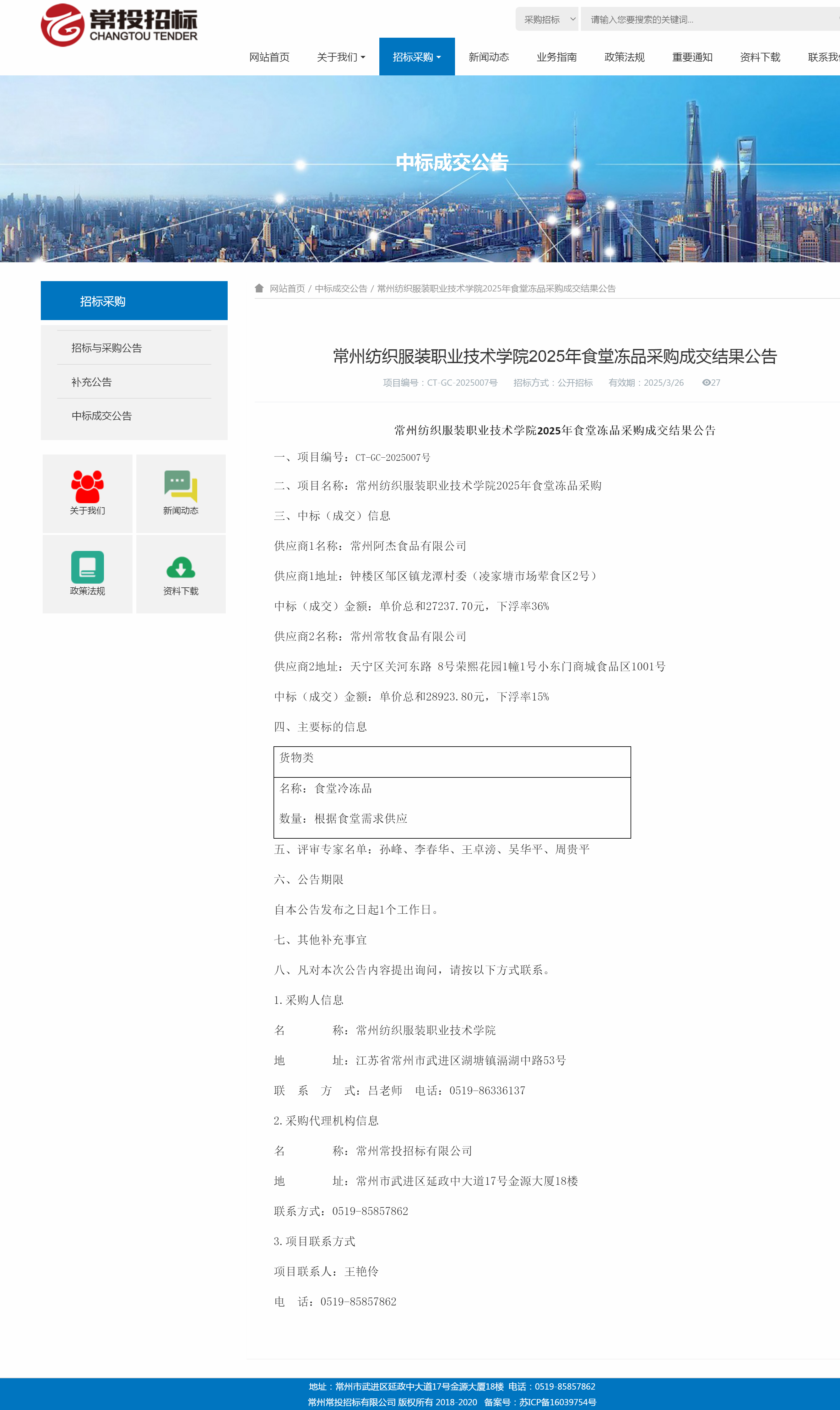 【中标公告】2025年食堂冻品采购项目中标结果公告