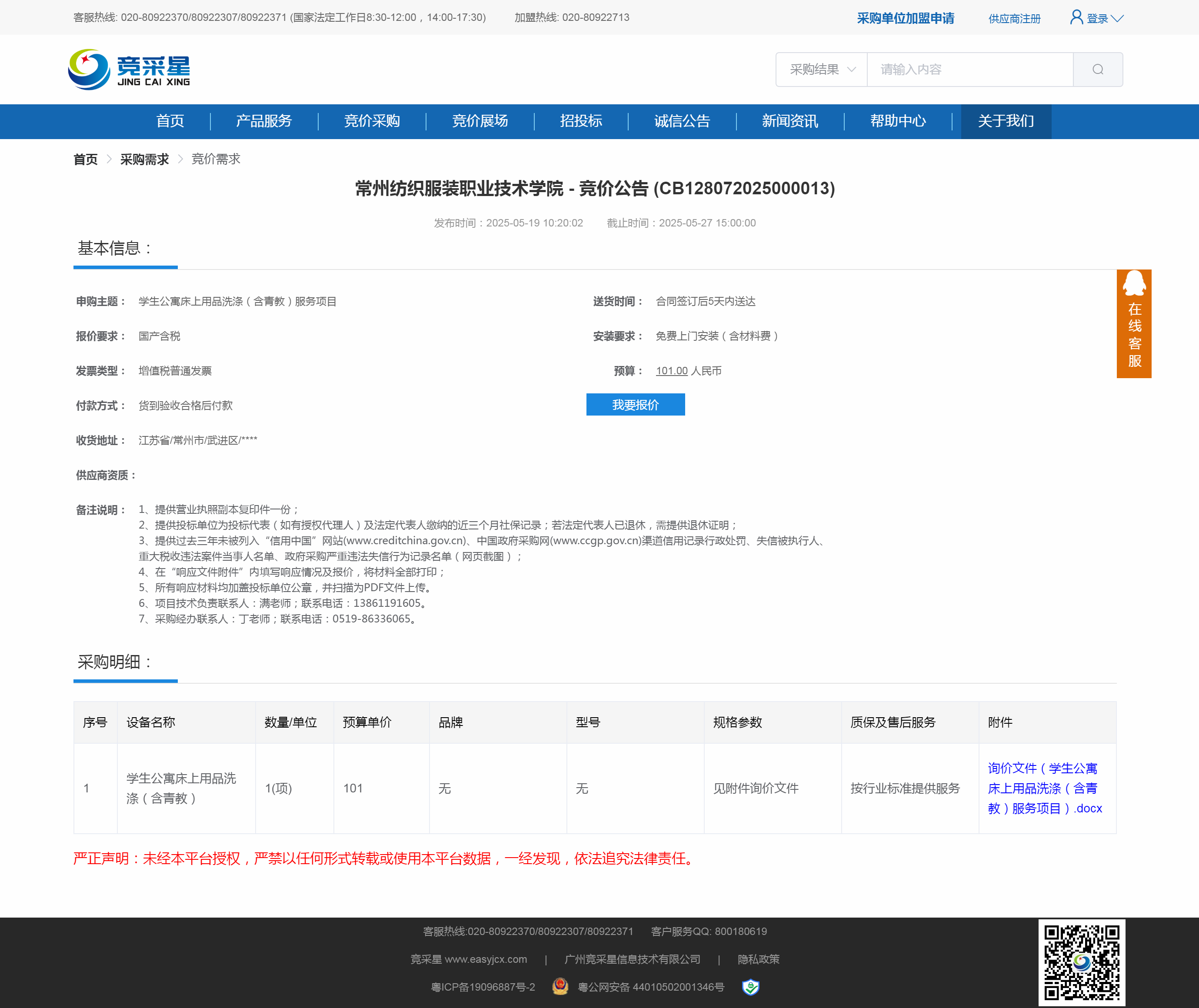【采购公告】学生公寓床上用品洗涤 (含青教)服务询价公告