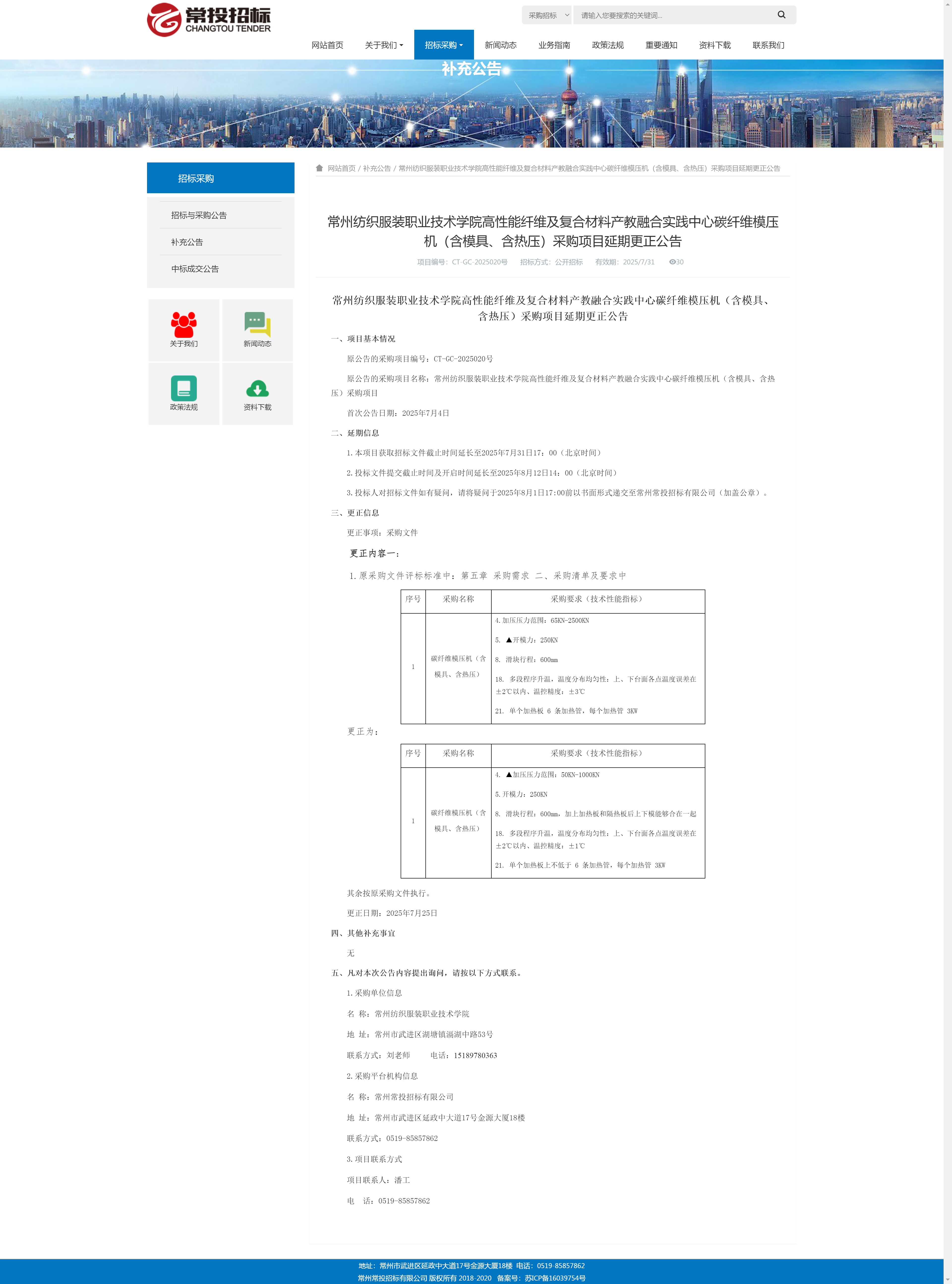 【延期更正公告】高性能纤维及复合材料产教融合实践中心碳纤维模压机(含模具、含热压)采购项目延期更正公告