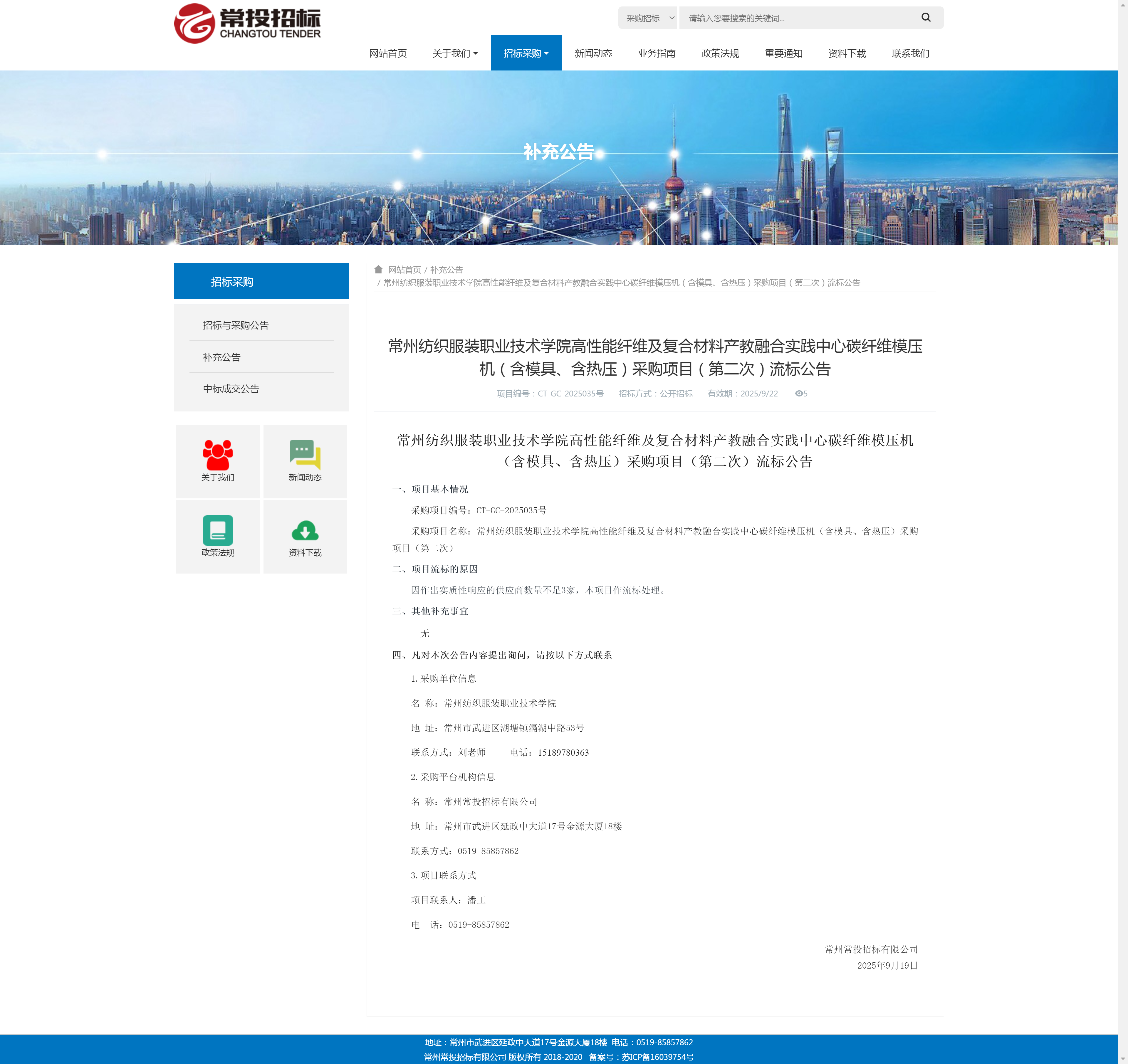 【流标公告】高性能纤维及复合材料产教融合实践中心碳纤维模压机(含模具、含热压)采购项目流标公告(第二次)