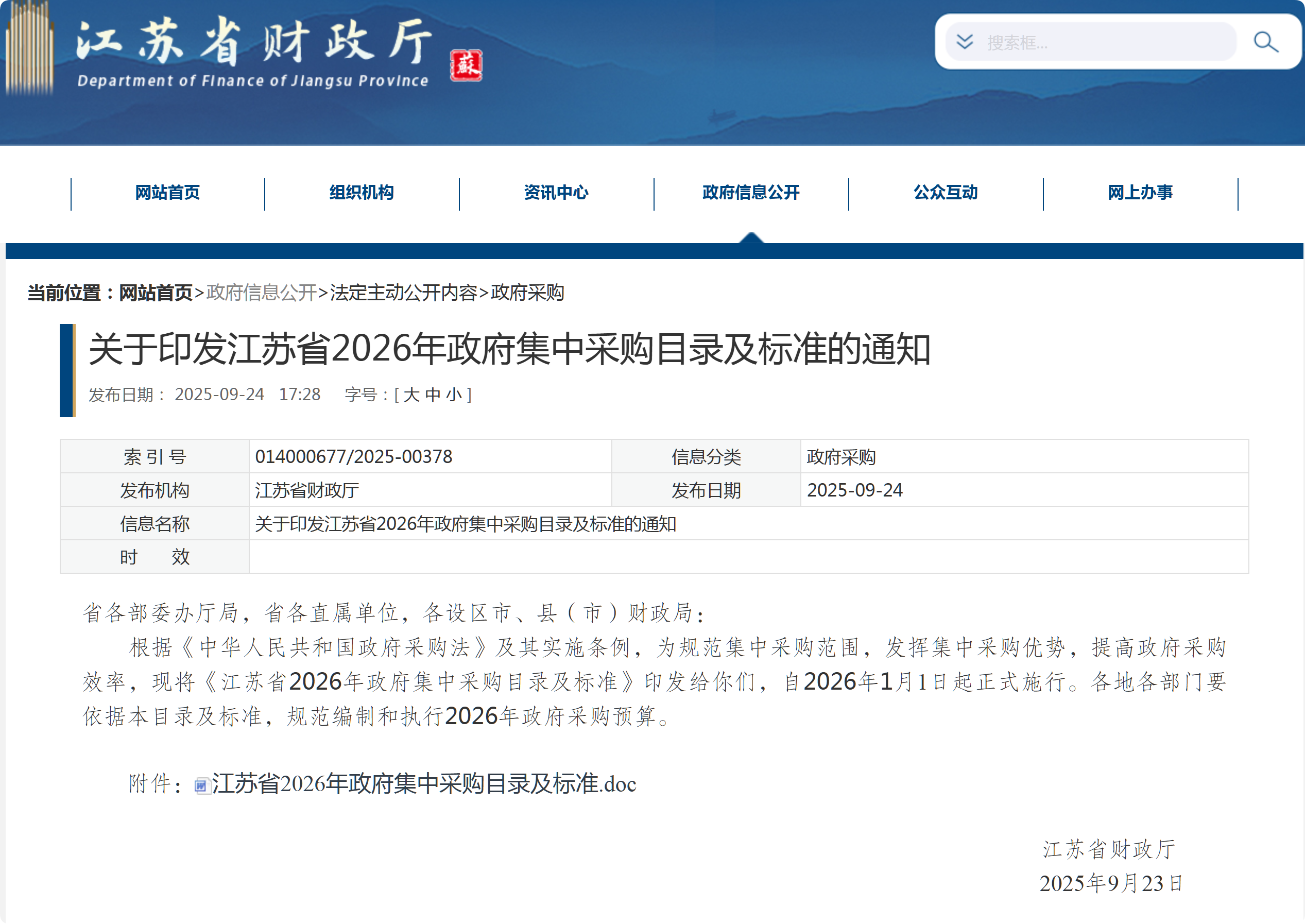 省财政厅关于印发江苏省2026年政府集中采购目录及标准的通知