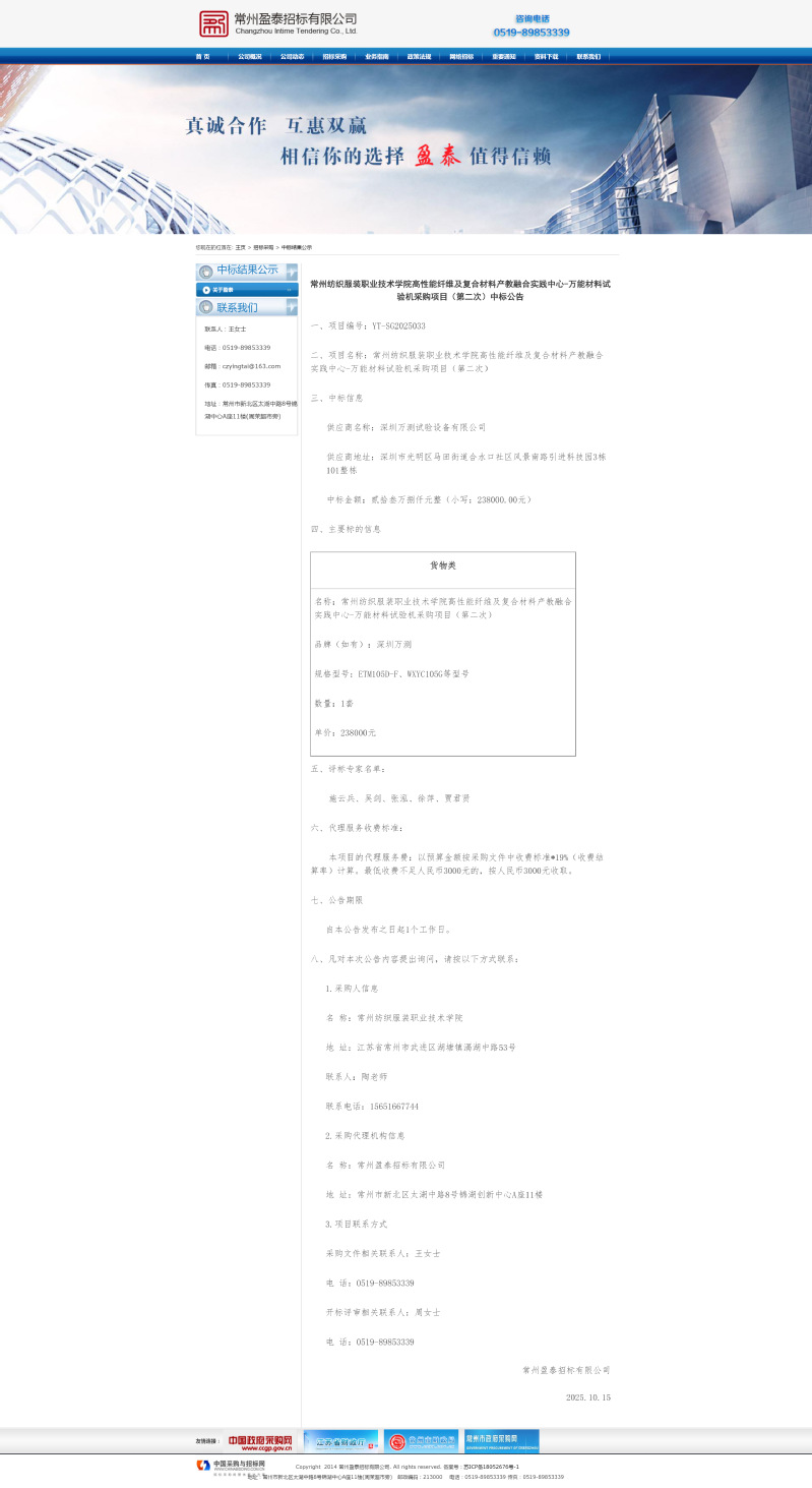 【中标公告】高性能纤维及复合材料产教融合实践中心-万能材料试验机采购项目中标结果公告