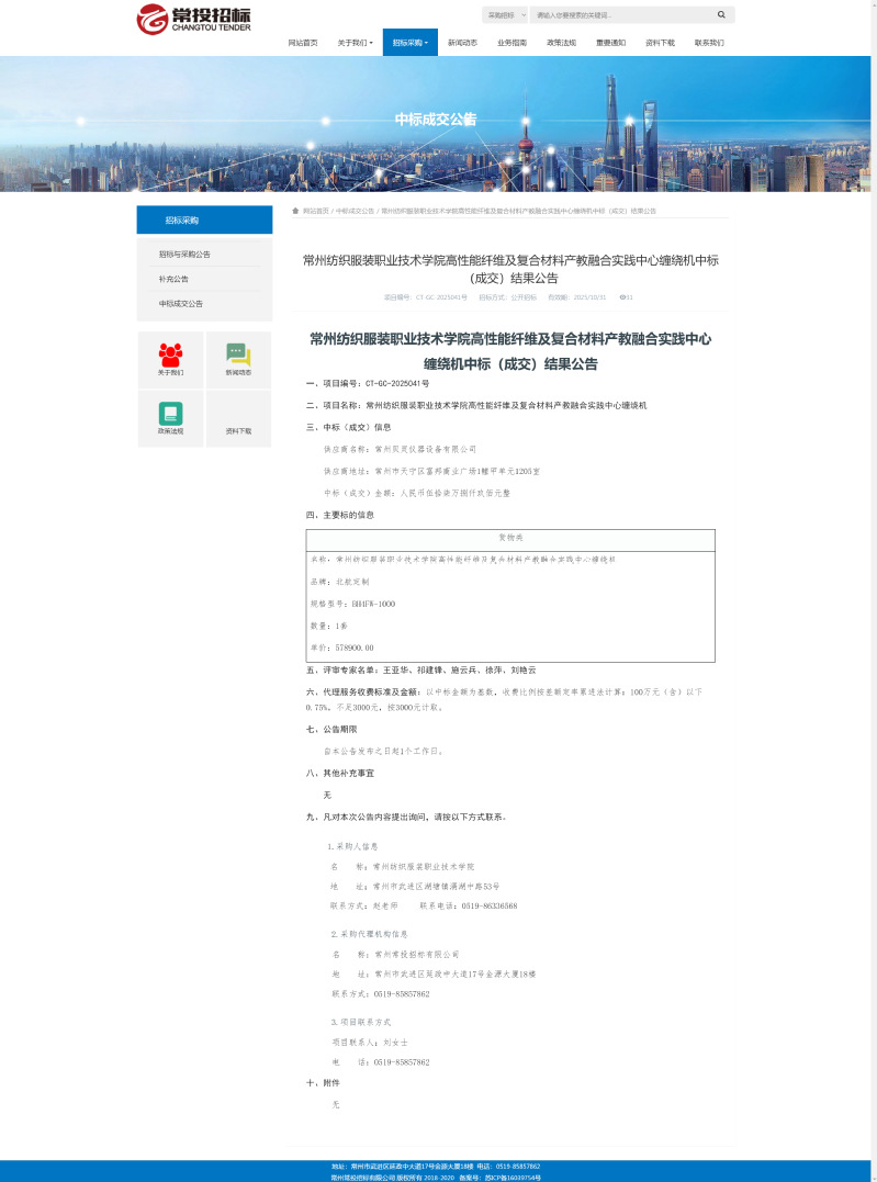 【中标公告】高性能纤维及复合材料产教融合实践中心缠绕机中标结果公告