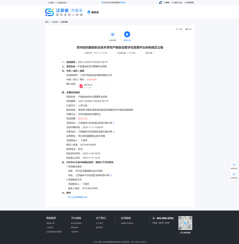 【成交公告】产教融合数字化管理平台采购项目成交公告
