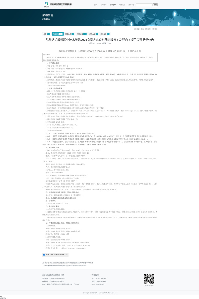 【招标公告】2026年食堂大宗食材配送服务(冷鲜肉)项目公开招标公告