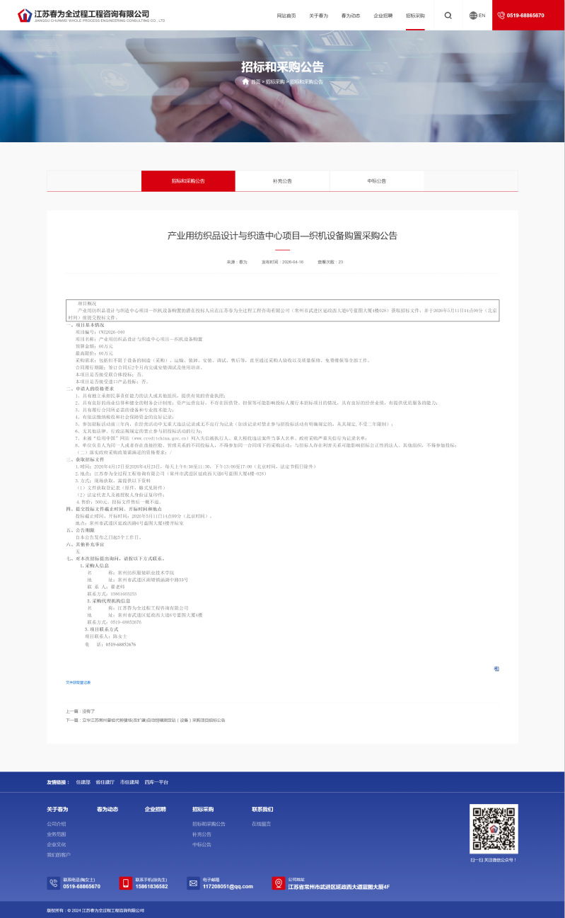 【招标公告】产业用纺织品设计与织造中心项目—织机设备购置公开招标公告
