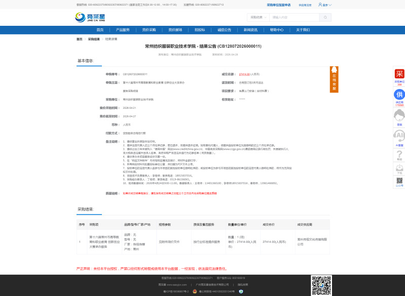 【成交公告】第十六届常州市高等教育和职业教育创新创业大赛承办服务采购项目成交公告